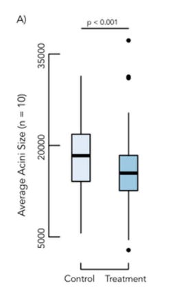 Acini : structures glandulaires microscopiques qui composent les glandes hypopharyngiennes des abeilles ouvrières. Leur taille reflète la capacité de l’abeille à produire de la gelée royale pour nourrir les larves, et diminue lorsque les colonies manquent de pollen.